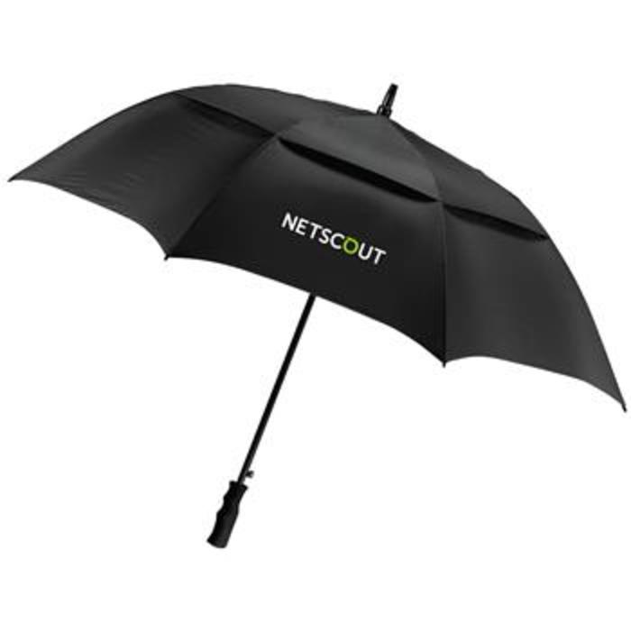 Auto open golf umbrella. 58” arc with fiberglass shaft and ribs. Duraflex construction. Vented to withstand wind gusts up to 50mph without inverting. Rubber spray, pistol-grip handle. Includes matching sleeve.