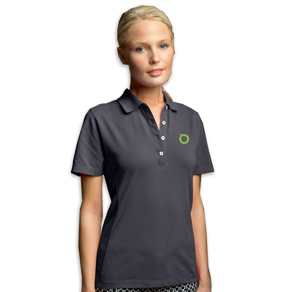 97% cotton/3% spandex, 5.5 oz., solid stretch pique body with rib-knit collar.