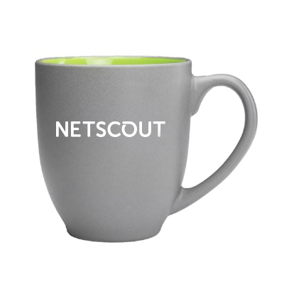 NETSCOUT branded 15 oz single wall ceramic mug with matte grey exterior and gloss lime interior.